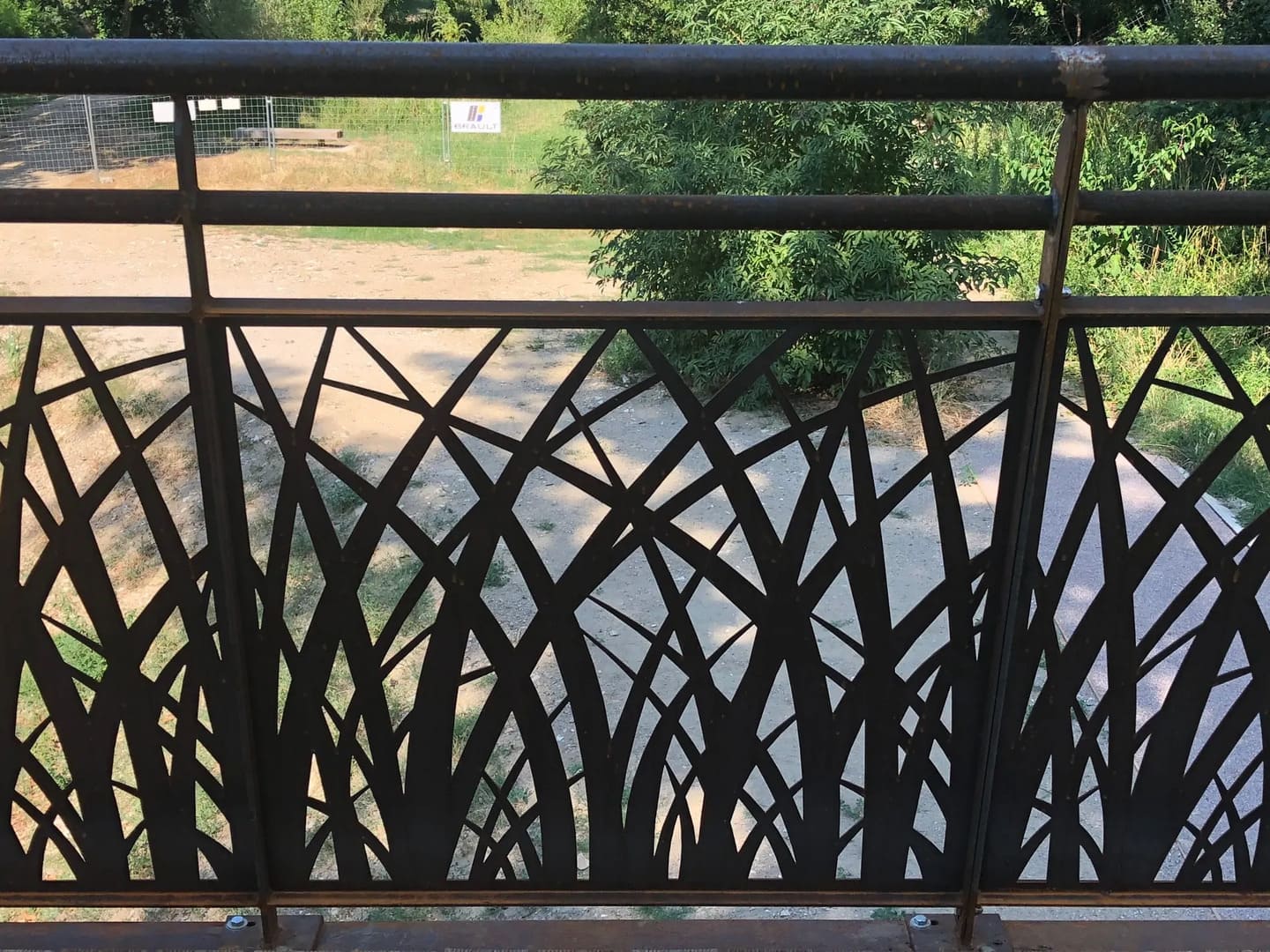 El diseño se enriqueció con seis pilares inclinados, inspirados en troncos de árboles, que aportan carácter y refuerzan la integración paisajística. A ello se suman barandillas de chapas caladas con motivos vegetales, pensadas para aportar ligereza visual y coherencia estética.